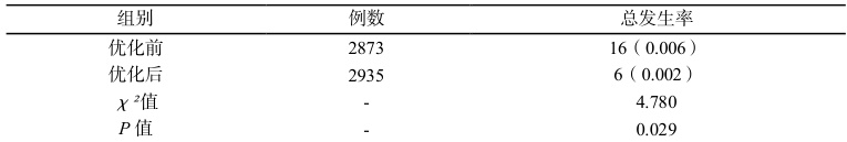 优化后医院感染发生率低于优化前(P<0.05)。见表 2。