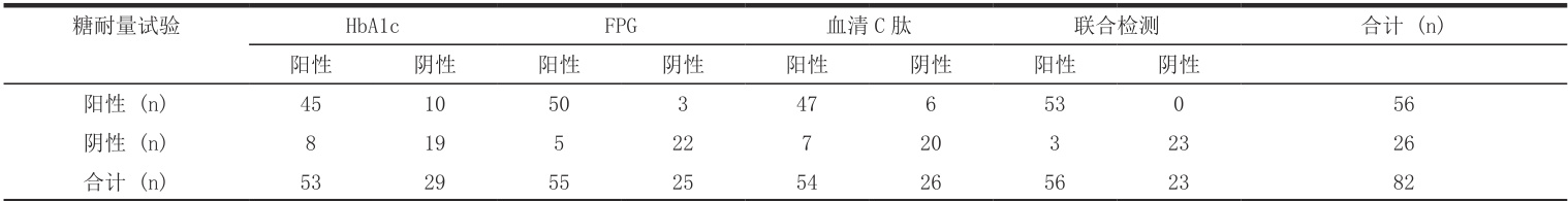 在 82 例疑似糖尿病患者中,糖耐量试验确诊阳性者 56 例。HbA1c、FPG和血清 C 肽分别检出阳性 53、55 和 54 例,其中对应正确识别的阳性病例为45、50 和 47 例。三项联合检测识别糖尿病阳性 53 例,且无假阴性,准确性明显优于单项检测。各方法在糖耐量试验阴性人群中的识别情况也显示,联合检测的误判率最低,阴性识别效果更佳。见表1。