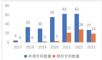 图1 2017-2023 年发明专利申请量与授权量统计通过对申请量和授权量的统计可以发现,申请量和授权量均呈现一定的上升趋势。但是相对于申请量授权量的比例相对较低,需要升专利的申请质量。