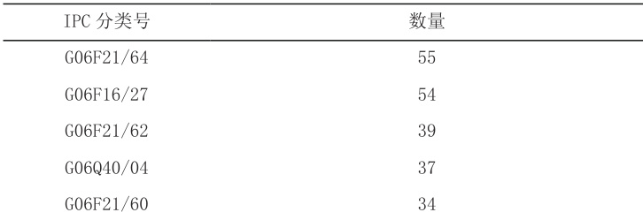 申请专利在 IPC 分类方面,G06F21/64 和 G06F16/27 是区块链技术领域出现频次最高的分类号,可见区块链领域在信息安全和分布式系统两个关键技术点具有较高的研究热度。表 4 授权专利 Top5 IPC 分类统计