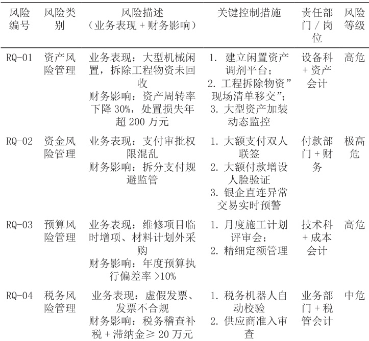 铁路企业深化改革与高质量发展的进程中,有效的合规风险管控体系已成为提升管理效能、增强核心竞争力的重要举措。现铁路企业已初步建立起“识别 - 评估 - 管控”的风险管理体系,铁路工务单位承担线路、桥隧等基础设施的维修养护任务,其业务活动(如大修施工、物资采购)与财务管理(如预算控制、资金安全)深度交织。传统模式下,业务部门侧重安全生产风险,财务部门聚焦资金合规风险,二者信息割裂,都存在风险识别盲区,如设备操作不当引发资产损失,进而导致成本超支,这些风险管理问题必然导致控制措施脱节、决策依据不足。