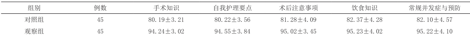 在健康知识掌握度上,观察组的手术知识、自我护理要点、术后注意事项、饮食知识、常见并发症与预防等均优于对照组,差异显著( P<0.05 )。如下: