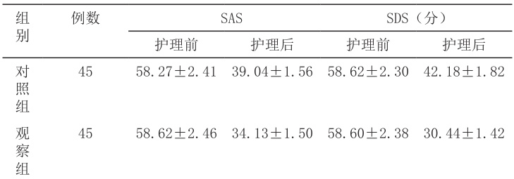 在护理后,观察组的SAS 和SDS 评分相较于对照组分值更低,差异显著( P<0.05 )。如下表: