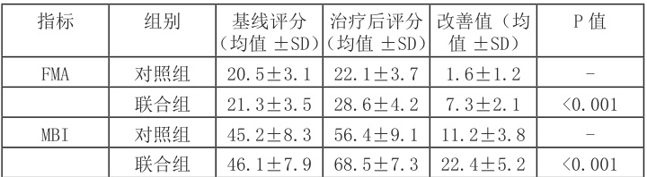 4.3.1 主要结局指标:FMA 评分:联合组治疗后评分提升至 28.6±4.2 ,显著高于对照组( 22.1±3.7 , P=0.003 ),提示运动功能改善更显著。MAS 评分:联合组痉挛缓解率达 63.3% (MAS 改善 ⩾1 级),显著高于对照组( 40.0% ,P=0.021⋅ ),可能与艾灸降低肌张力有关。MBI 评分:联合组日常生活能力提升幅度为 35.2% ,显著优于对照组( 22.8% , P=0.001 ),表明
