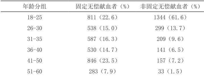 固定无偿献血者中,41-50 岁年龄组人数最多,有 846 人 (23.5% ),其次是 18-25 岁年龄组,有 811 人(22.6%),51-60 岁年龄组人数最少,有283 人(7.9%)。而在非固定无偿献血者中,18-25 岁年龄组人数最多,有 1344 人,占比达 61.6% ,51-60 岁年龄组人数最少,为 33 人 (1.5%)i 。无偿献血者年龄分布存在差异,年龄越大,成为固定献血者的比例越高,其差异有统计学意义( c2=990.256 , P<0.001) 。结果见表1。
