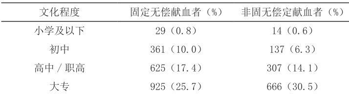 固定献血者中,本科学历者人数最多,有 1379 人(38.4%),其次是大专学历者有 925 人( 25.7% ),小学及以下学历者最少,仅有 29 人,占比为 0.8%∘ 。非固定献血者中,本科学历者人数最 Z ,有 920 人( 42.1% ),小学及以下学历者最少,有14 人(0.6%)。文化程度的差异有统计学意义( c2=51.539,P<0.001) 。结果见表2。