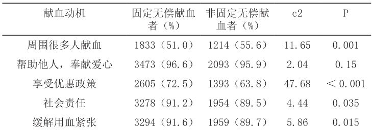 从无偿献血者的献血动机来看,固定无偿献血者中选择“帮助他人,奉献爱心”的无偿献血者占比最高,但与非固定无偿献血者的差异无统计学意义。这可能是因为“帮助他人,奉献爱心”是无偿献血者的较为普遍献血动机,在本次研究中固定无偿献血者与非固定无偿献血者选择“帮助他人,奉献爱心”的献血动机的比例均很高,未能体现出差异。而“缓解用血紧张”和“社会责任”是当前采供血现状的长期表现和需求,也促使要求献血者能长期参与献血活动;而“享受优惠政策”则表现在用血费用减免(浙江省内无偿献血者个人献血量达到 400ml 以上,即可实现终身用血免费;其次个人献血量还与直系亲属的免费用血量成正比)以及“三免政策”(免费游览政府投资主办的公园、旅游风景区等场所,到非营利性医疗机构就诊免交门诊诊查费,免费乘坐城市公共交通工具)[8] 上。这些优惠政策需要献血者长期参与献血活动才能达成,从而促使其成为固定献血者。