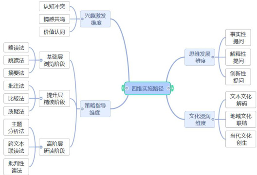 3.深度学习理论:美国学者Ference Marton 倡导在阅读中实现记忆、理解、应用、分析、评价、创造的认知进阶。本研究通过"三阶四维"模型将其具象化:在阅读预读阶段,运用“SQ3R 阅读法”(Survey-Question-Read-Recite-Review)培养批判性思维;在拓展阶,通过“假如我是主人公”剧本创作促进创造性思维。北京师范大学王蔷团队的实证研究显示,采用“问题链驱动”的深度学习模式,可使学生高阶思维发展水平提升 37% 。