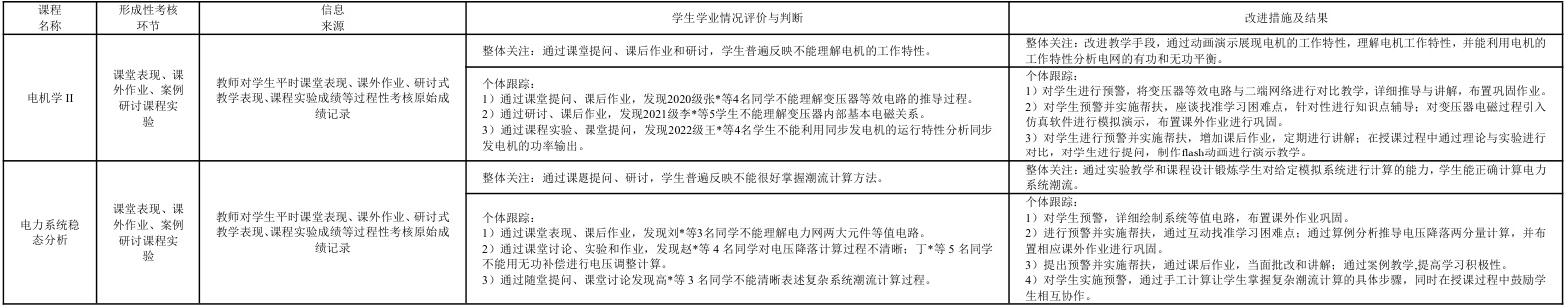以《电机学 II》和《电力系统稳态分析》两门课程为例,说明课程目标的常态化形成性评价机制的运行以及对学生学业跟踪与改进情况,如表 2 所示。