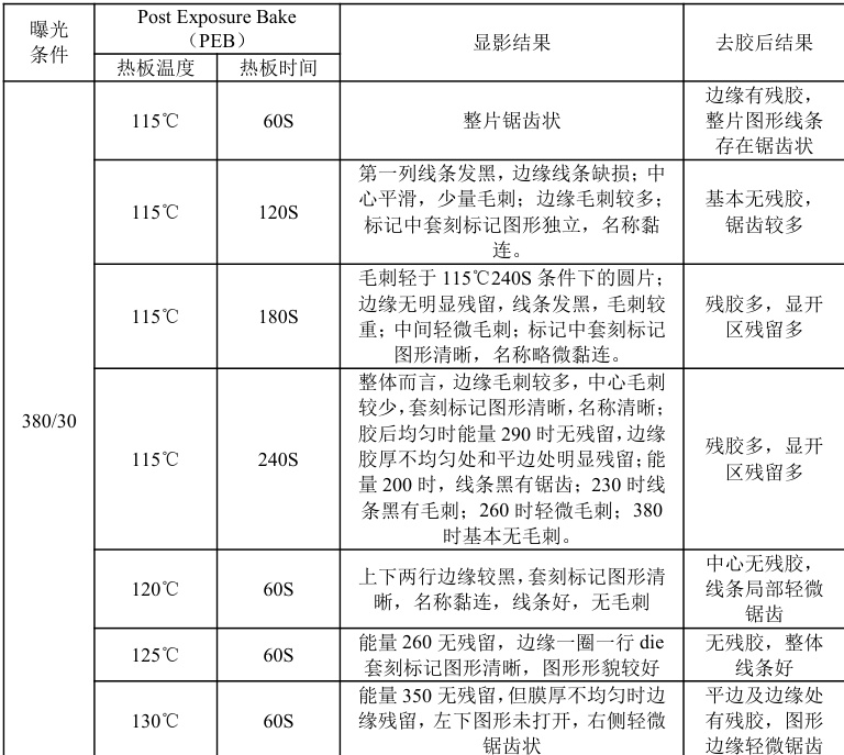 在实验初期使用在线生产所用PEB 工艺,显影后 PI Space 区胶条形貌差,局部会出现锯齿情况,影响晶圆表观。通过对不同PEB 温度拉偏,发现PEB 温度对此异常影响较明显,因此对PEB 温度进行控制变量分析。