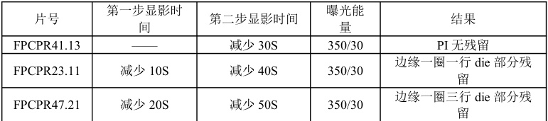 当在显影总时长 111S 的基础上减少50S 后,圆片边缘最边缘一圈管芯开始出现显影残留,因此显影总时长至少需在 61S 以上才可保持图形正常。