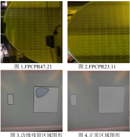图 1 及图 2 分别为 FPCPR47.21 晶圆和 FPCPR23.11 晶圆的光检照片,图 3 及图 4 分别为FPCPR47.21 晶圆和 FPCPR23.11 晶圆的显微镜镜检照片,从图中可明显看到光检异常及镜检异常:圆片边缘出现了不同程度的残留,图形未被正常显开。此两片实验条件分别为缩短显影时间共计50s 及70s,同时从实验结果来看,显影时间减少 30s 时,PI 图形无残留,随着显影时间缩短,图形的显开情况更差。
