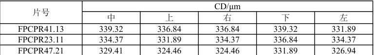 同时在显影后,分别测试 FPCPR41.13、FPCPR41.11、FPCPR41.21 三片晶圆图形的 CD,测试方法为5 点测试法,分别测试圆片的中、上、右、下、左5 处位置的图形CD,其结果如下表 3 所示。