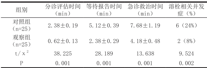 结合表 1 数据结果得知,观察组患者分诊评估时间、等待报告时间及急诊救治时间均短于对照组患者,且溶栓相关并发症发生率总和更低( ΔP<0.05⟩ ),组间有统计学意义。