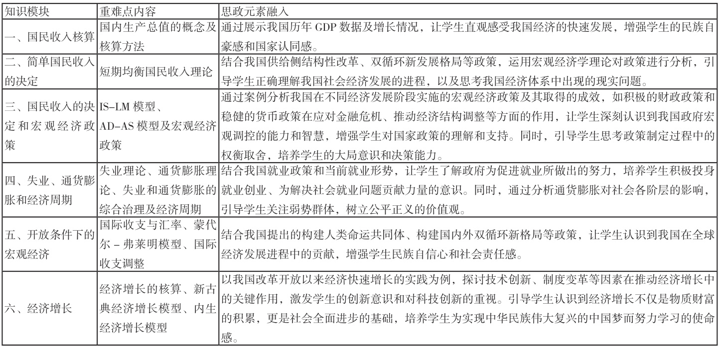 将思政元素融入课程,丰富宏观经济学的教学内容,引导学生坚定理想信念。本课程的知识模块、教学内容及其对应的思政元素设计如下表所示: