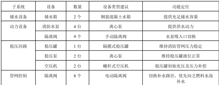 消防水生产系统包含储水设备、动力设备、稳压回路以及管网控制四个部分。在核电站所有运行工况下,消防水生产系统均保持可用,处于备用状态,稳压回路投入自动控制,空压机根据系统压力进行启停,维持消防管网压力在正常运行范围,稳压泵根据稳压罐液位自动启停。此外,当乏燃料水池辅助系统发生管道破口并且已经隔离的情况下,消防水生产系统可以经由消防管网,向乏燃料水池提供补给水,确保乏燃料水池有足够的水装量,持续导出乏燃料水池的余热。消防水生产系统的主要设备如表 1 所示: