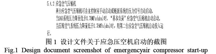 围绕以上问题对某核电厂的应急压空机开展研究。首先通过对设计文件的查阅,发现其压缩机型号为ZT160S 无油螺杆压缩机,可由主控制室手动启动或根据系统的压力信号自动启动,设计文件截图见图1。同时通过查阅应急压空机的逻辑图得到压空机的启动逻辑如下:1、当压空机在“备用”运行模式,当系统压力降低到 0.66MPa.g 时压力开关触发,应急压空机启动;2、当压空机在“基本负荷”运行模式,当系统压力降低到0.68MPa.g 时压力开关触发,应急压空机启动;3、在控制室手动启动。