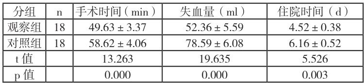 观察组手术时间、术中失血量、术后住院时间均少于对照组(P<0.05 )。