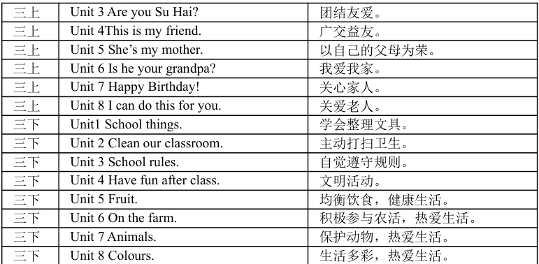 结合译林小学英语三年级新教材教学,我将各单元德育目标进行梳理,总结如下: