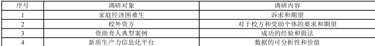本课题结合“发展型资助育人”的最新理论成果,调研资助对象在资助育人方面的诉求和期望,调研资方对于资助的要求和期望,调研成功典型的资助案例。具体调研对象与内容如表1 所示: