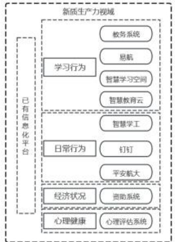 对校内新质生产力平台的调研显示,校内虽有多种分析学生数据的APP及数字化平台,但实际有效的信息源较少,且受权限限制,数据壁垒依然存在,因此筛选有价值的数据源是进行学生行为分析的基础。以某行业高校的信息化建设为例,其已围绕学习行为、日常行为、经济状况、心理健康建立起若干系统如图 1。