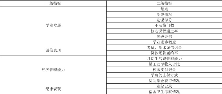基础维度包含 4 个一级指标、16 个二级指标,核心目标是确保受助学生满足高校基本培养要求,为后续发展奠定基础。其中,“学业发展”指标不仅关注平均学分绩点、核心课程通过率等“绝对成绩”,还通过“个体内差异评价法”设置“学业进步幅度”指标,重点考察受助学生的相对成长;“诚信表现”直接关系到资助资格的延续,涵盖学术诚信记录、贷款还款履约率等关键数据;“经济管理能力” 聚焦财商素养培育,通过“月均生活费规划合理性”“勤工助学收入占比”等指标,引导学生树立理性消费观念;“纪律表现”则关注学生日常行为规范,包含违纪记录、宿舍卫生达标率等基础指标。具体指标如表 2 所示: