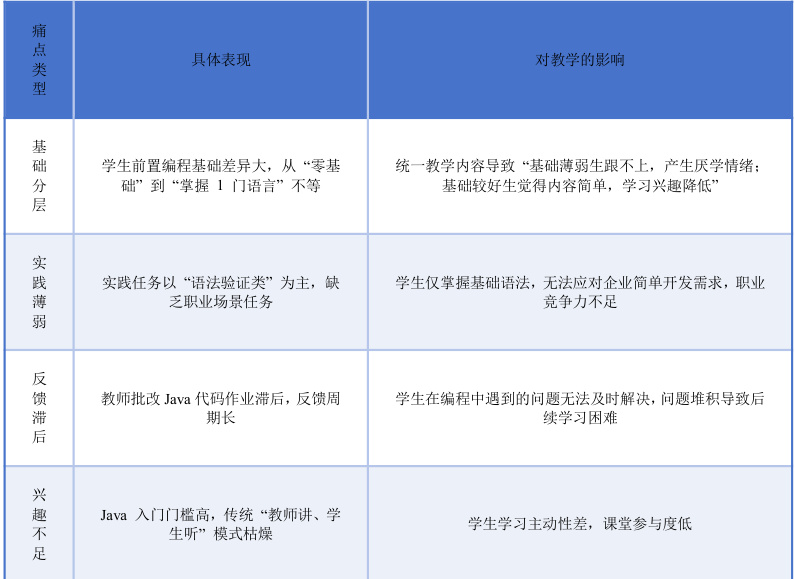 《Java 程序设计》具有“三重属性”:一是实践性,课程70%内容需通过编程实践巩固;二是逻辑性,面向对象思想抽象度高,需学生具备较强逻辑思维;三是职业关联性,课程内容对接企业需求,为后续课程铺垫。结合前期《Java 程序设计》教师的集体研讨,教学痛点如下表所示: