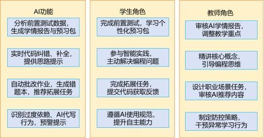 该模式的核心原则是“AI 辅助而非替代”:教师负责教学设计、思维引导与风险把控;AI 承担重复性、个性化任务(如学情分析、代码初评);学生在AI 支持下自主学习、主动实践,实现按需学、高效学、会应用。2.教学全流程的创新应用策略
