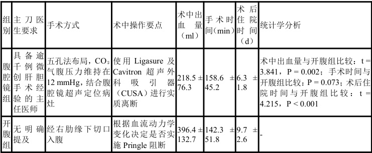 LLR 组由微创团队主刀,采用四至五孔法,CO₂气腹压力维持在 12-14mmHg 。术中常规行 Pringle法间歇性肝门阻断,结合CUSA 与 Ligasure 系统精细离断肝实质,切除范围≤3 个Couinaud 肝段。复杂区域(如Ⅶ/Ⅷ段)由经验丰富的张建平主任医师主刀,术前联合 IQQA-Liver 三维重建系统规划路径与切缘,确保精准切除。OLR 组主要采用右肋缘下斜切口,必要时延伸为“人”字形切口,直视下完成规则性或局部切除,根据出血及中心静脉压决定是否行全肝血流阻断。两组均严格遵循肿瘤根治原则,确保整块切除、无瘤操作,术中常规行快速冰冻病理检查,切缘≥1 cm 且无残留,避免肿瘤破裂或胆汁漏,保障手术根治性与质量一致。