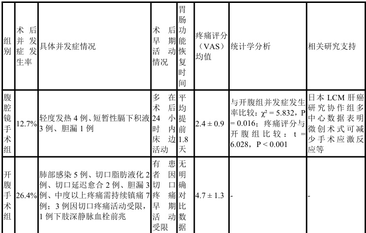 腹腔镜手术组术后并发症发生率为 12.7% ,开腹手术组为 26.4% ,两组比较差异具有统计学意义x2=5.832 , P=0.016) ,提示微创术式在降低术后不良事件风险方面具备显著优势。具体而言,开腹组共出现14 例并发症,其中肺部感染 $5 \textcircled { \lvert { \it ‰} \textless \textmu \textgreater \textmu \textmd { ) } }$ ,切口脂肪液化与延迟愈合各 2 例,胆漏3 例,中度以上疼痛需持续镇痛者7 例;腹腔镜组则以轻度发热(4 例)和短暂性膈下积液(3 例)为主,未见切口相关并发症,胆漏发生1 例,经保守治疗后顺利恢复。值得注意的是,开腹组有 3 例因切口疼痛导致术后早期活动受限,进而引发深静脉血流淤滞,影像学证实1 例出现下肢深静脉血栓前兆,需抗凝干预。相比之下,腹腔镜组患者多在术后24 小时内实现床边活动,胃肠功能恢复时间平均提前1.8 天,疼痛评分(VAS)均值为 2.4±0.9,显著低于开腹组的 4.7±1.3(t=6.028, P<0.001. )。该结果与国内外多项研究趋势一致,如日本LCM 肝癌研究协作组的多中心数据显示,微创术式可有效减少手术应激反应,抑制炎症因子释放,改善免疫微环境,从而降低感染与全身性并发症的发生风险。