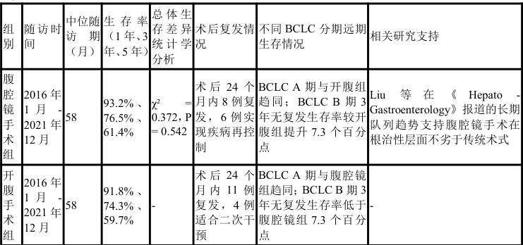 对两组患者实施系统性随访,时间跨度为2016 年 1 月至 2021 年 12 月,中位随访期达 58 个月。腹腔镜手术组1 年、3 年、5 年生存率分别为 93.2% 、 76.5% 、 61.4% ,开腹组对应指标为 91.8% 、 74.3% 、59.7% 。经 Kaplan-Meier 生存曲线分析并以 Log-rank 检验验证,两组间总体生存差异无统计学意义( χ2=0.372 , P=0.542, )。值得注意的是,腹腔镜组中有 8 例患者于术后第 24 个月内出现肝内复发,其中6 例接受射频消融或再次微创切除,实现疾病再控制;开腹组同期复发 11{H} ,因残肝功能储备偏弱及粘连严重,仅4 例适合二次干预。进一步按 BCLC 分期分层分析显示,在BCLC A 期患者中,两组远期生存趋同,而在 BCLC B 期亚组,腹腔镜联合术中荧光导航实现了对微小病灶的精准清除,其3年无复发生存率较开腹组提升7.3 个百分点。该现象提示,尽管总体生存未见显著差异,但微创技术在特定临床情境下可能通过提升手术精确度与后续治疗可及性,间接优化肿瘤学结局。此结果与 Liu 等在《Hepato-Gastroenterology》报道的长期队列趋势相呼应,支持腹腔镜手术在根治性层面不劣于传统术式。
