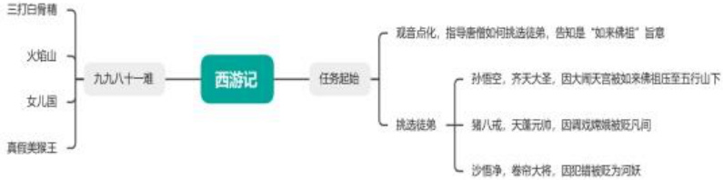 通过其绘制的思维导图,帮助学生更好地理解了《西游记》的故事脉络,首先是观音菩萨点化唐僧,并赋予其神圣的取经任务,取得真经只为普度众生,所挑选的徒弟均为在天界犯错被贬凡间的天将,首先是在花果山水帘洞称王的“齐天大圣”孙悟空,在孤身闯天界后成为“弼马温”,最后大闹天宫被如来佛祖降服压在五行山下五百年等待唐僧取经;猪八戒在犯错后被贬凡间误入高老庄意图侵占高小姐被孙悟空降服踏上取经之路;沙悟净被贬后受观音菩萨点化成为唐僧的徒弟。在取经队伍“集结”后踏上漫长的取经之路,一路上师徒四人降妖除魔,经历了九九八十一难,踏过火焰山,越过通天河,最终顺利到达西天取得真经。