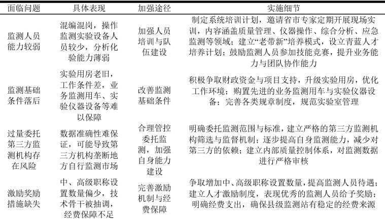 以某县级环境监测站为例,该站主要面临监测人员能力、监测基础条件、委托第三方监测风险以及激励奖励措施缺失等问题。下面通过表格形式呈现问题及对应加强途径: