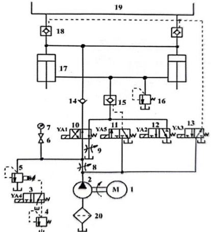 1.电动机 2.柱塞泵 3. 11.12.13.二位三通换向阀 4.调压阀 5.先导溢流阀 6.压力开关 7.压力表 8、9 节流阀 10.二位四通换向阀 14.单向阀 15 .液控单向阀 16.溢流阀 17.液压缸18.液控单向阀 19.油箱 20.过滤器