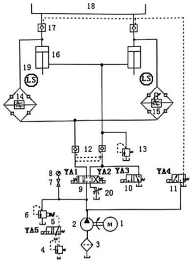 1 电动机 2 柱塞泵 3 过滤器 4 调压阀 5 10、11 二位三通换向阀 6 先导溢流阀 7 压力表开关 8压力表9 三位四通换向阀 12 液控单向阀13 溢流阀 14 调速阀15 比例调速阀16 液压缸 17 液控单向阀18 油箱 19 位移传感器20 节流阀
