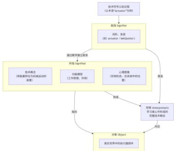 符号三元关系(Representamen-> Interpretant -> Object):根据皮尔斯的符号学理论,一个符号过程包含三个要素:符形(Representamen,符号本身,如术语词形)、符释(Interpretant,符号在使用者心中唤起的概念)和对象(Object,符号所指代的真实事物或过程)。学生术语习得的困境,往往是符形与符释之间发生了断裂。他们可能记住了"actuator" 这个词形,但心中并未形成关于“将电信号或流体能量转化为机械运动的装置”这一清晰的心理概念,更无法将其与真实的执行器部件对应起来。