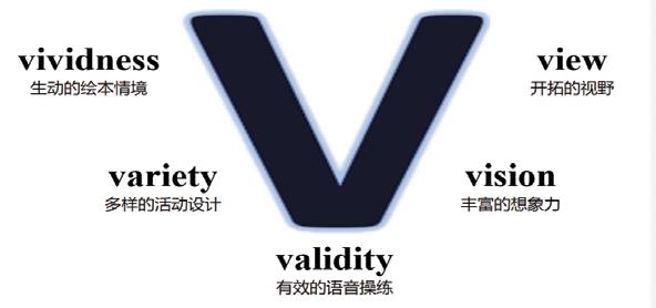 基于绘本的自然拼读 V 型教学模式充分利用丰富的绘本资源,以vividness, variety, validity, vision, view 五 V 模式(图 1)构建课堂教学。