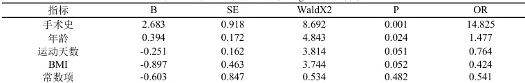 对老年人手术史、年龄、每4 周大于15 分钟运动时间的天数、BMI 等因素与是否存在肌少症之间的关系进行分析。