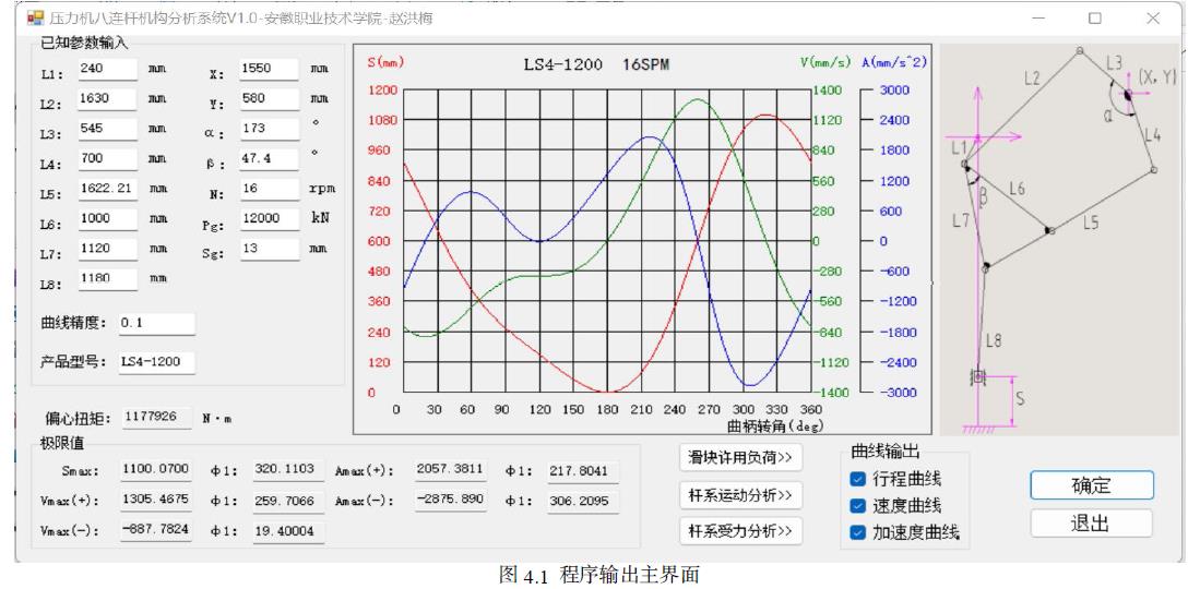 现以某公司一种八连杆拉延压力机为例分析说明,压机行程次数16 min-1,行程1000mm,公称力12000 kN。杆系参数:L1=240mm,L2=1630mm,L3=545mm, L4=700mm,L5=1622.21mm,L6=1000mm,L7=1120mm,L8=1180mm,X=1550mm,Y=580mm,α=173°,β=47.4°运行后,程序输出界面如图4.1 所示。