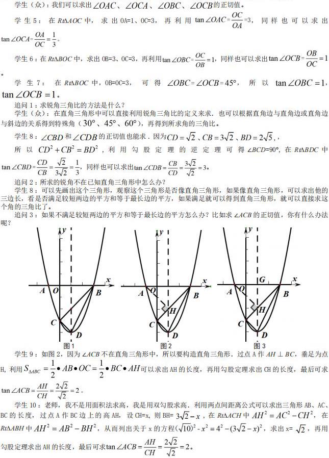《义务教育数学课程标准(2022 年版)》指出,课程目标以学生发展为本,以核心素养为导向,进一步强调学生获得数学基础知识、基本技能、基本思想和基本生活经验,发展学生运用数学知识与方法发现、提出、分析和解决问题的能力。可见初中数学教学主要通过教师合理有效的教学设计,培养学生良好的思维习惯,逐步形成核心素养。下面笔者以“二次函数背景下锐角三角比求法探究”中考专题复习课为例,结合学生实情、教材特点和考试要求,用问题串驱动学生主动思考,发展学生思维。