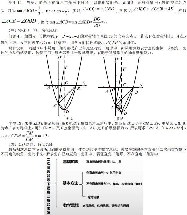 在上海各个区的一模、二模和中考试卷中,24 题经常考查二次函数与锐角三角比及相似的综合运用,第二、三问求锐角三角比的概率很大,所以设计了这节课。在问题 1 到问题 4 中,教师根据学生的认知规律,设计二次函数图像上的特殊点到利用两点间距离公式求线段长,再到图形的周长、面积,最后到角的三角比的求法,由点到线到面层层递进,引导学生去发现问题、解决问题。问题 3 和问题 4 设计所求角在直角三角形中、要证直角三角形、作高构造直角三角形、到用含字母代数式表示锐角三角比,从无参到含参层层递进,由特殊到一般,逐步渗透方程思想、化归思想及数形结合思想,增强学生解决 24 题二次函数综合题的信心。通过设计由简单到复杂的发散性问题,让学生主动思考,提高学生学习兴趣,点燃学生学习数学的希望之火。