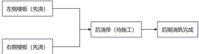 图 1 中展示了楼板后浇带的典型施工流程,左右两侧楼板先行浇筑,中部区域作为后浇带保留,在结构变形趋于稳定后再进行封闭浇筑,形成连续整体结构,有效降低应力集中带来的裂缝风险。