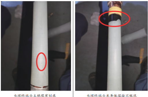 检测人员对某煤矿6kV 变电所进行开关柜、电缆不停电检测,在对 1 回路入井电缆采用高频脉冲法局放检测时,检测人员发现A 相电缆高频电流图谱异常,存在明显放电特征,异常脉冲信号呈工频相关性且幅值较大,最大达 716mv ,频率约 15MHz(正常情况为无异常脉冲信号,幅值相同且一般根据负荷和磁场环境不同在几十毫伏左右)。对比于其他电缆,以及该电缆三相间对比(另外两相有较低幅值的异常脉冲信号),初步怀疑该相电缆内存在局放现象,为进一步确定故障位置和严重程度,使用超声波法辅助检测。在电缆表面不同位置放置超声波传感器,发现A 相电缆终端头主绝缘区域超声波信号强度明显高于其他区域,且信号频率特征与局部放电产生的超声波信号特征相符。综合两种检测方法结果,确定该段电缆A 相确实存在局放现象,建议停电进行检查处理。煤矿安排专业维修人员对该段电缆进行停电检修。电缆终端头解体检查后发现,发现A 相电缆终端头主绝缘有划痕,半导体搭接不规范,存在明显缺陷,与检测结果一致。维修人员现场制作新的电缆终端头,并对新电缆进行严格的绝缘测试正常后送电投运。运行一段时间后,再次进行局部放电检测,高频电流信号和超声波信号均恢复正常,表明隐患已成功消除,保障了煤矿井下的安全供电。
