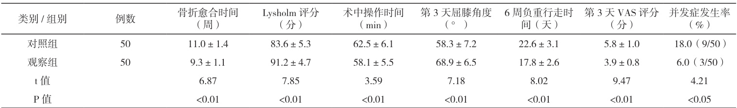 观察指标包括骨折愈合时间、膝关节功能评分、术后并发症发生率及术中操作时间与住院天数,均由两名评估医师独立测定并取平均值进行统计分析。