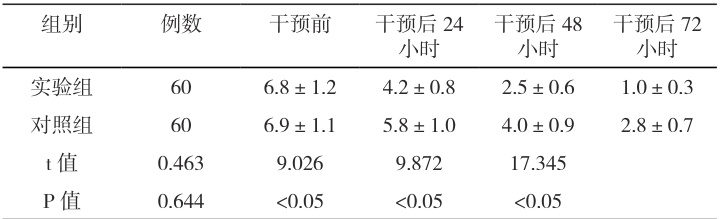 干预前,两组患者疼痛程度评分比较,差异无统计学意义( ⟨P⟩0.05 )。干预后 24 小时、48 小时、72 小时,两组患者疼痛程度评分均较干预前明显降低 (P⟨0.05) );且实验组患者疼痛程度评分明显低于对照组,差异具有统计学意义( ⋅P<0.05 )。具体数据见表2。