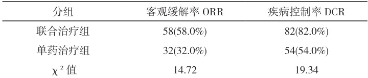 联合治疗组 ORR 为 58.0% (58/100),显著高于单药组的 32.0% (32/100)( χ2=14.72 , P<0.05 );DCR 分别为 82.0% 与 54.0% ,差异亦具统计学意义( P<0.05) 见表 1 。