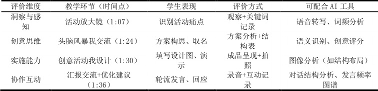 表现性评价在综合实践活动中需聚焦学生在真实任务中的综合表现,评价维度不仅包含创意构思的独特性与问题导向的准确性,也包括动手能力的实现程度与操作技能的熟练水平。在江苏综合教材的项目化学习框架下,《创意课间我做主》课例以“优化课间活动方案”为任务核心,学生需在观察、构思、实施、展示的全过程中体现多方面能力,评价体系应覆盖创意思维的生成逻辑、材料处理的实操表现、问题应对中的策略转化,以及团队协作中的互动结构。过程投入作为关键指标,反映学生在每一阶段中的持续性参与与自主性水平,需结合 AI 记录工具对操作频率、任务停留时间、参与轮次等数据进行捕捉与建模,辅助教师进行跨阶段综合分析。维度划分应围绕行为可观察、评价可执行、反馈可应用的原则展开,确保表现性评价在课堂中具备诊断价值与改进导向。为验证上述三维评价维度在教学现场的适配性,本文选取《创意课间我做主》课例为实践样本,梳理教学过程中各环节与评价维度的对应关系。通过学生实际活动表现,结合教师观察与智能工具辅助,实现多维指标的可观测、可诊断与可反馈。表1 为课例中评价维度与教学环节的映射关系示意。