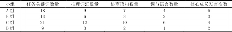 C 组在各类关键词上表现 具有较强的问题推进能力。A 组任务关键词数量较高, 辑延展与情绪引导略显不足。B 组与D 组关键词类型覆盖有限, 核心成员 作互动偏向单向推动,协同广度与深度不足。