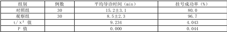 观察组患者的平均导诊时间短于对照组,挂号成功率高于对照组,差异均具有统计学意义(P<0.05)。具体数据见表1。