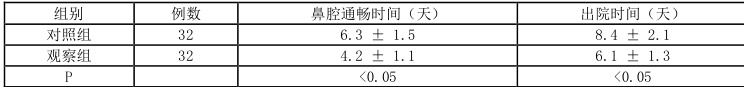 观察组出院时间、鼻腔通畅时间均显著短于对照组 (P⟨0.05) )。见表1。